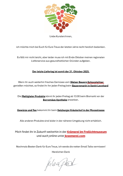 Stornierungen bzw. Pausierung einer ABO Bestellung: bis spätestens Mittwoch 08:00 für die Auslieferung in selbiger Woche, spätere Stornierungen können leider nicht entgegen genommen werden.